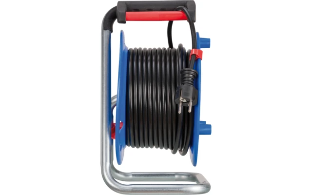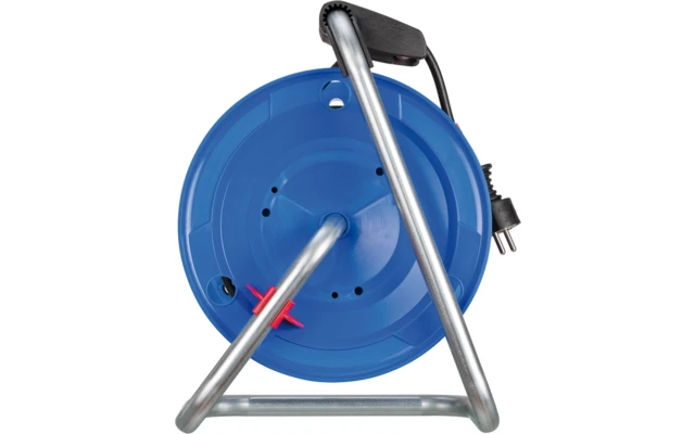 - Kabeltrommel für innen mit einem Trommelkörper aus Spezialkunststoff auf verzinktem Tragegestell und einem ergonomischen Handgriff mit Achse für perfekte Kabelführung beim Auf- und Abrollen