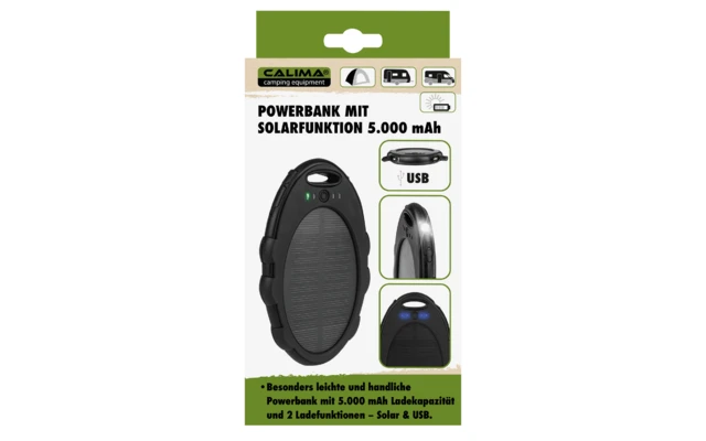 - Aufladung der besonders leichten Powerbank durch Solarpanel oder USB möglich