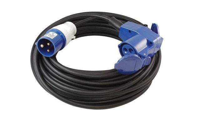 Neoprenkabel 3×1,5 mm² CEE-Stecker und gewinkelter CEE-Gegenstecker mit zusätzlicher Steckverbindung.