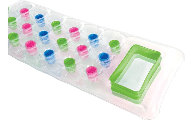 Entspanntes Sonnenbaden auf dem Wasser. Mit der 188 x 71 cm großen Luftmatratze „18-Pocket Suntanner Mat“ von Intex im transparenten Design mit bunten Taschen ist das möglich. Das integrierte Kopfkissen, zwei Luftkammern und ein 0,28 mm starkes Vinyl sorgen für Festigkeit und angenehmen Liegekomfort.