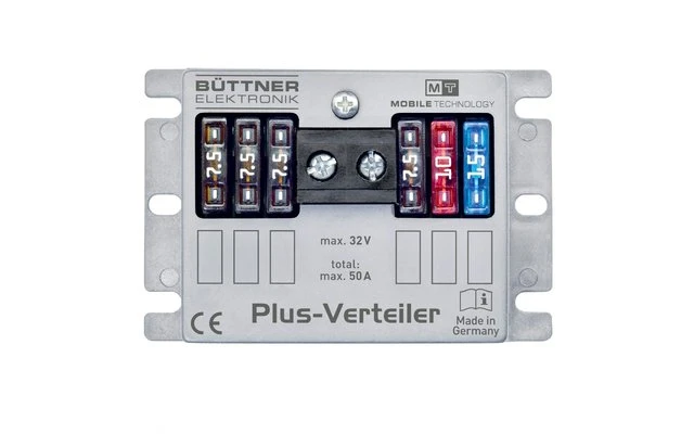 Optimaler Verteiler und Sicherungsblock für die Batterie-Plusseite. Stromzuführung über Sammelklemme (max. 50 A); Verteilung über einzelne Ausgänge. Bestückt mit sechs Sicherungen 4 x 7,5A; 10A, 15A.