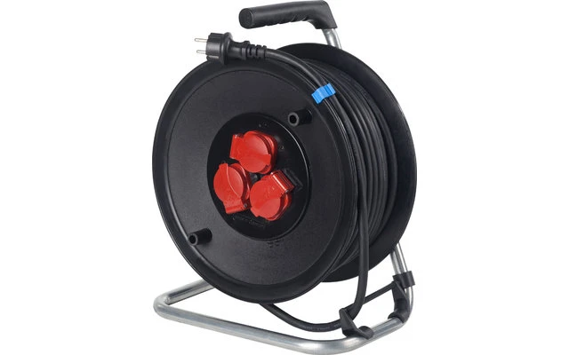 Für den ständigen Einsatz im Freien. Trommelkörper aus schlagfestem Spezialkunststoff mit 3 Schutzkontakt-Steckdosen und Klappdeckel, Thermoschutzschalter, Kabelclip zur Leitungsfixierung, mit Wiederanlaufsperre und Rückstellknopf