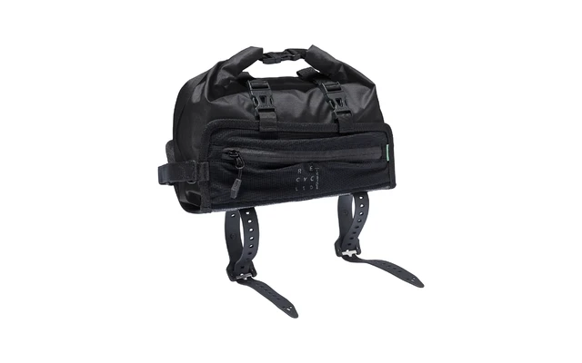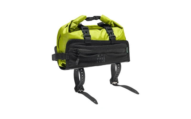Die wasserdichte Packtasche wird mit Reißverschluss gesichert und je nach Beladung – max. 3 Liter – wasserdicht gewickelt und in der Halterung über zwei mit mit Steckschnalle geischerte Gurte fixiert. Soll bei einem Stop schnell mal was gekauft werden, ist die der Packsack schnell aus der Halterung entnommen und mit dem mitgelieferten Tragegurt umgehängt. Die Oberrohrtasche ist nicht nur ein praktischer Begleiter fürs Bikepacking. Sie leistet auch ganze Arbeit in Sachen Umweltschutz, denn sowohl Halter als auch Packsack bestehen zu 100 % aus recycelten Materialien.